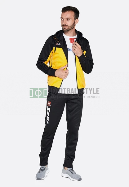 TUTA OLYMPIA – мужской спортивный костюм от итальянского бренда Zeus. Пошит из высокотехнологичной ткани – мягкого полиэстера. Этот материал приятен к телу, имеет высокую прочность, не растягивается и долго не теряет изначальный вид после стирок. Ткань отличается высоким уровнем воздухопроницаемости и хорошо отводит излишнюю влагу от тела. Благодаря этому даже активные занятия спортом будут проходить в сухости и комфорте. Купить мужской спортивный костюм этой модели можно как для тренировок, так и повседневного ношения. Костюм состоит из штанов и кофты с длинным рукавом. На рукавах и подоле штанин есть манжеты на резинках, которые ограничивают скатывание. Они же защищают от попадания холодного воздуха при тренировках на открытом воздухе. Кофта имеет контрастный цветовой дизайн. Застегивается на замок-молнию, имеет капюшон и карманы на замках.