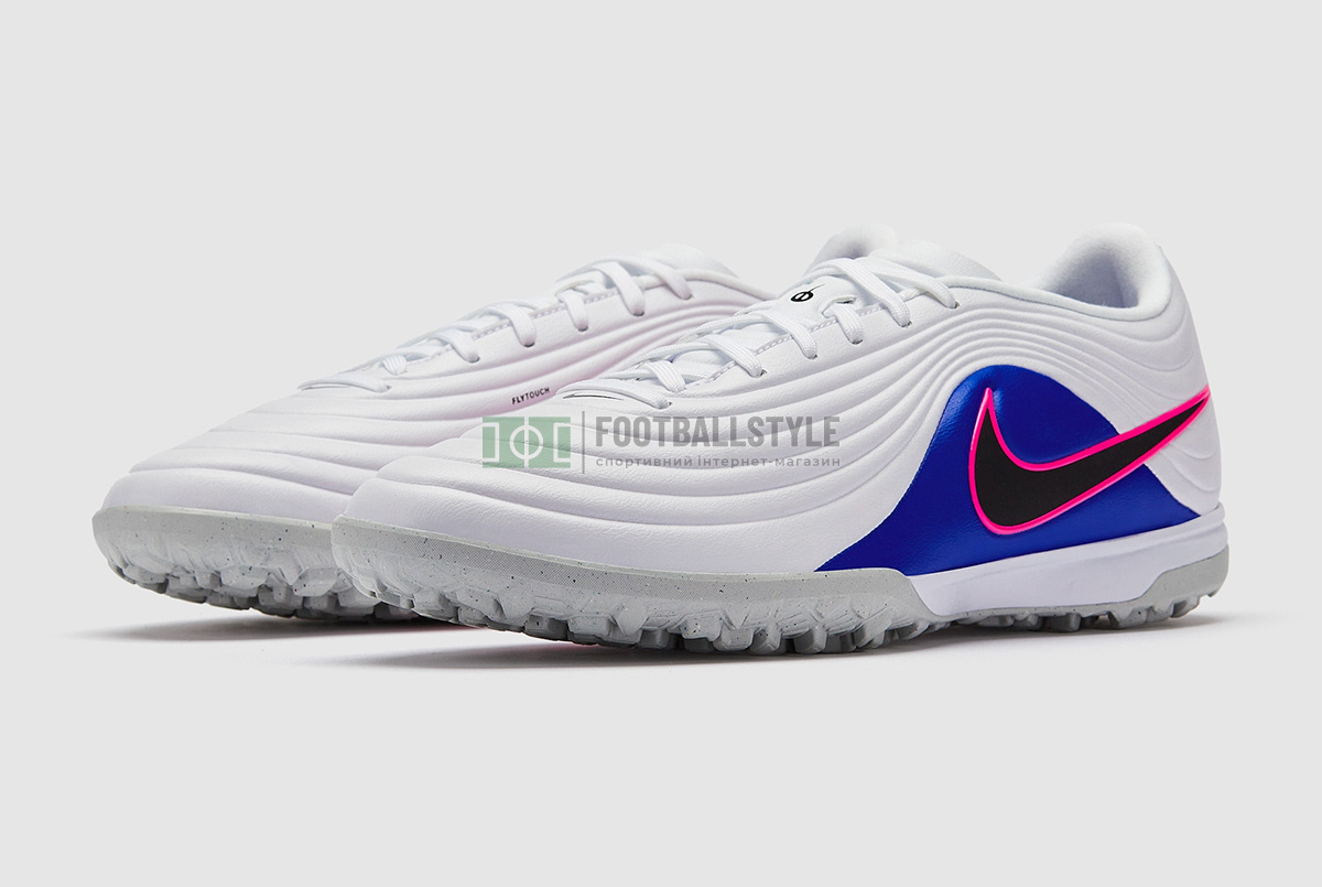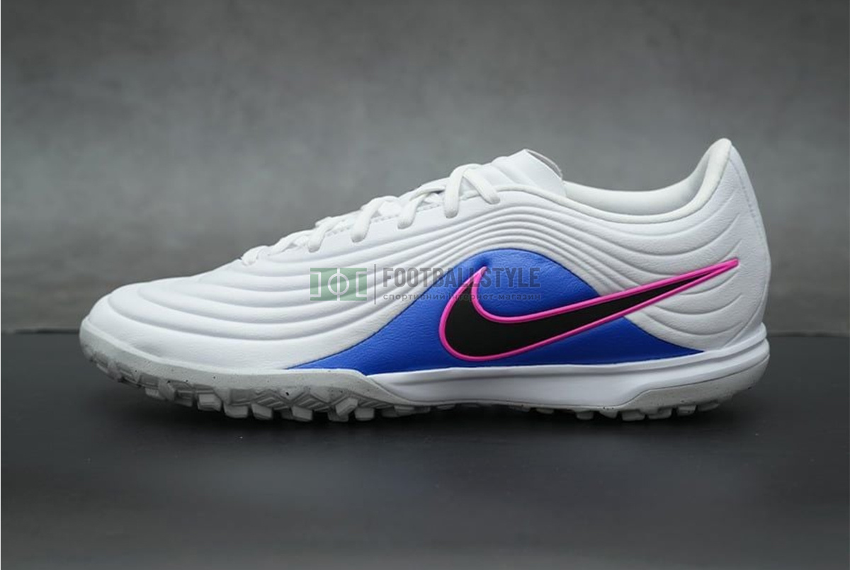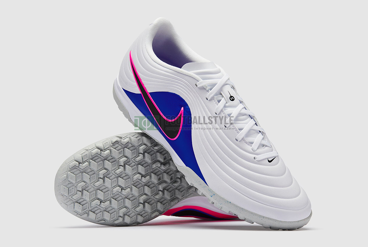 Играйте с изяществом и мастерством в футбольных сороконожках Nike Tiempo Maestro Academy TF IB4484-146 в бело-черно-сине-розово-белой расцветке.