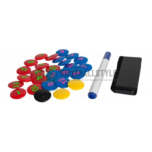 Комплект для тактических досок. В составе: Магнитные фишки красного (12 штук), желтого (2 штуки), синего (12 штук) и черного цвета (1), Губка, Маркер