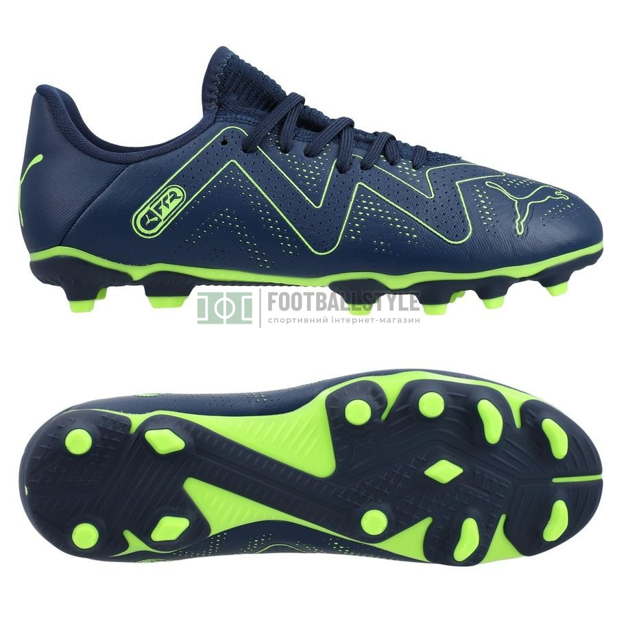 Puma Footwear Future Play Fg/Ag Jr Permanent Green Blue 107388-03. Бутси для підлітків Виготовлений із легких, але дуже міцних матеріалів. Підошва взуття призначена для гри на футбольному полі із природним покриттям. Конструкція підошви заснована на спеціальній швидкісній технології, що забезпечує ефективність під час бігу. Туфлі прикрашені логотипом бренду Puma.