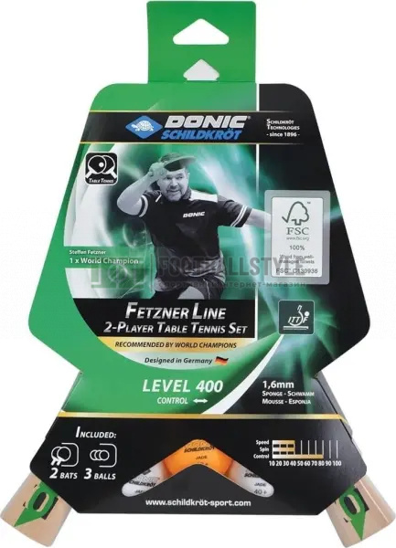 Набір для настільного тенісу Donic Fetzner 400 - це високоякісний набір із прийнятною якістю для розваги, а також для шкільних занять спортом. У набір входять 2 ракетки Fetzner 400 і 3 м'ячі Donic Jade. Схвалено ITTF (Міжнародною Федерацією настільного тенісу). Швидкість: 40. Обертання: 40. Контроль: 80. Товщина губки: 1,6 мм.