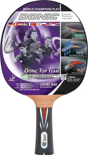 Ракетка для настільного тенісу Donic Top Team 800 дасть Вам змогу зі збільшенням швидкості отримати додаткову стабільність. Ефективна під час приймання жорстких, агресивних ударів. Конструкційно являє собою 5-шарову основу, накладку Vari Slick/Champion 1,8 мм. Ручка ERGO ідеально лягає в руку, повторюючи лінії долоні. Завдяки дерев'яній вставці з'являється відчуття, що ручка і головка ракетки є одним цілим. Округла форма дерев'яної вставки нейтралізує тиск на руку і забезпечує надзвичайно зручний і приємний хват ракетки. Система AVS (Anti Vibe System) використовується для зменшення вібрацій і поліпшення контролю м'яча. Ця система включає два спеціальних м'яких шари, розташованих у ручці ракетки. Технологія PLS (Power Lite System) допомагає істотно знизити вагу ракетки і поліпшити показники швидкості і балансу. Схвалено ITTF (Міжнародною Федерацією настільного тенісу). Серія: Top Team. Швидкість: 70. Обертання: 80. Контроль: 70. Товщина губки: 1,8 мм. Розмір ракетки: 25,8 х 14,7х 1,2 см. Вага: 0,25 кг.