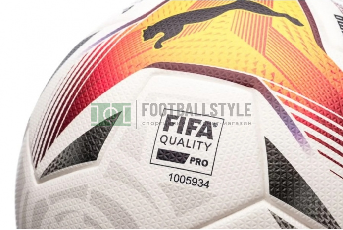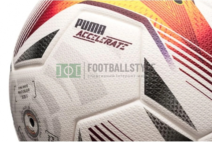 Футбольний м'яч Puma LaLiga 1 Accelerate FIFA Pro 083645-01 з унікальною конструкцією з восьми панелей із тривимірною текстурованою поверхнею 1,2 мм для покращення аеродинаміки має сертифікат якості FIFA , що гарантує високу продуктивність.
