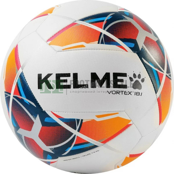 Футбольний м'яч Vortex 18.1 9806137 іспанського бренду спортивного екіпірування Kelme. Коло: 675-710 мм. Вага: 382 - 468 г. Кількість панелей: 10. Матеріал камери: Бутил.