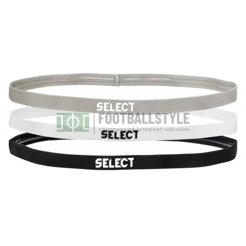 Розмір: універсальний. Комплектація: 3 штуки в одній упаковці. Колір: чорний, білий, сірий. Матеріал: 65% нейлон, 35% еластан. Рекомендації: для занять спортом. Особливості: Тримає волосся на місці під час занять спортом. Внутрішня сторона виконана з силікону для запобігання зісковзування пов'язки з голови. Невеликий логотип SELECT на зовнішній стороні.