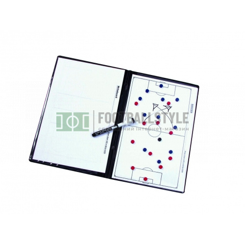 Планшет тренера універсальний (тактична дошка) - один з кращих тактичних планшетів для тренерів. Магнітно-маркерна тактична дошка для футболу, гандболу, баскетболу, волейболу, великого тенісу, бадмінтону, регбі, флорболу, хокею на льоду. Зроблена у вигляді теки (синтетична шкіра) з магнітною і немагнітними сторонами з двома внутрішніми прозорими кишенями. В один з кишень поміщаються для роботи паперові макети майданчиків, а інший призначений для зберігання макетів (немагнітна сторона теки). У набір входять маркер з ластиком, фішки чотирьох кольорів, порожній бланк для записів (без макета). Упакована в прозору теку з кишенькою для візитки.