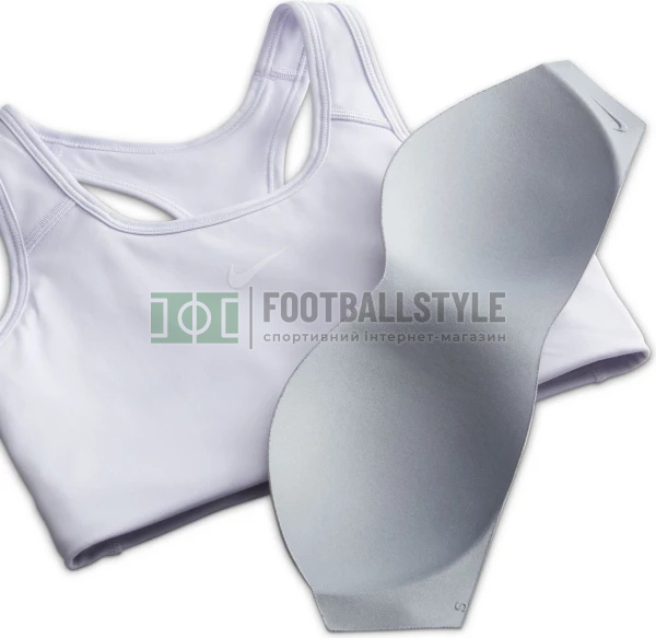 Спортивне бра Nike Dri-FIT Swoosh зі знімною цільною вкладишою, яка легко вставляється у вертикальну кишеню, створює гладку поверхню та зберігає форму навіть після численних прань. Ця модель виконана з тканини, у складі якої міститься щонайменше 50% переробленого поліестеру. Технологія Dri-FIT відводить вологу та забезпечує комфорт. Знімна цільна вкладка не зміщується і не змінюється, забезпечуючи надійну і зручну посадку. Кишеня для вкладки відкривається зверху і також підходить для телефону. Модель забезпечує середню підтримку для тренувань у залі, сайклінгу, крос-тренінгу, тенісу та бігу.